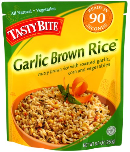 - 6 pack of 8.8 oz Tasty Bite Garllic Brown Rice is a nutty brown rice with roasted garlic, corn and vegetables. Enjoy with Tasty Bite Entrees; stir fry with vegetables; side dish to broiled fish